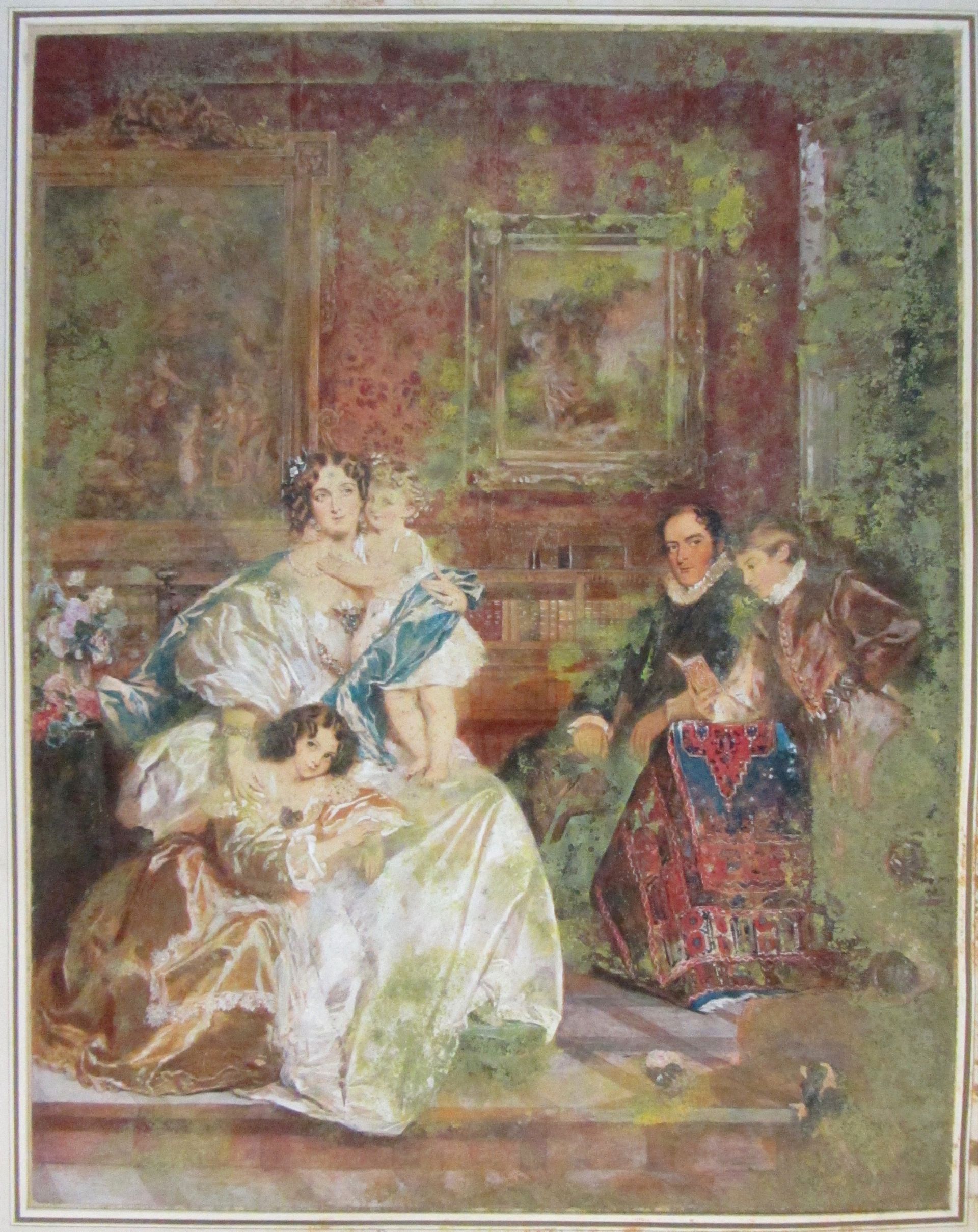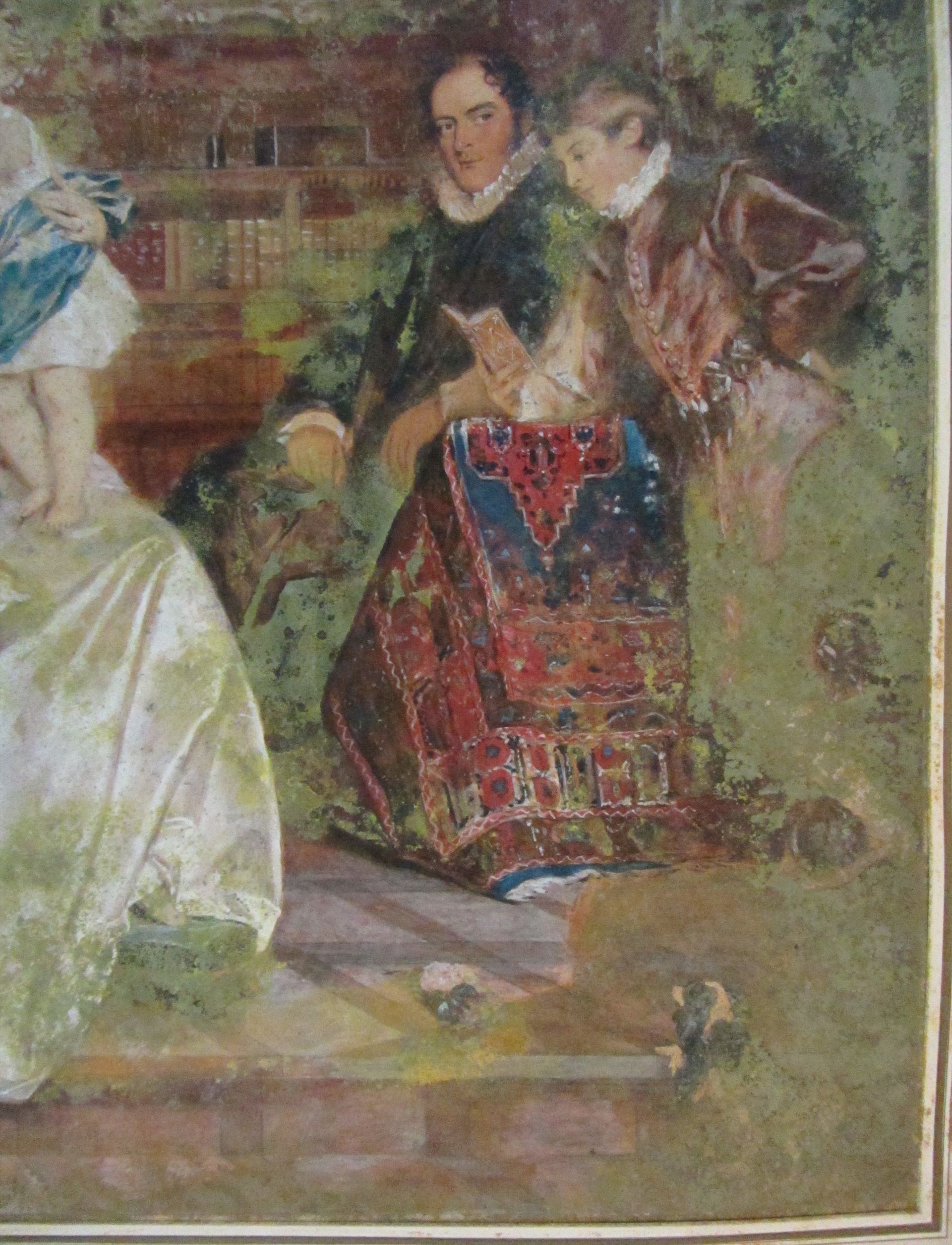 Following flooding this large 19th century painting, in its original frame and wash lined mount, was severely infested with mould. The image portrays a family group painted in watercolour and gouache. The thickly encrusted mould spores covered large areas of the portrait, changing its appearance dramatically.